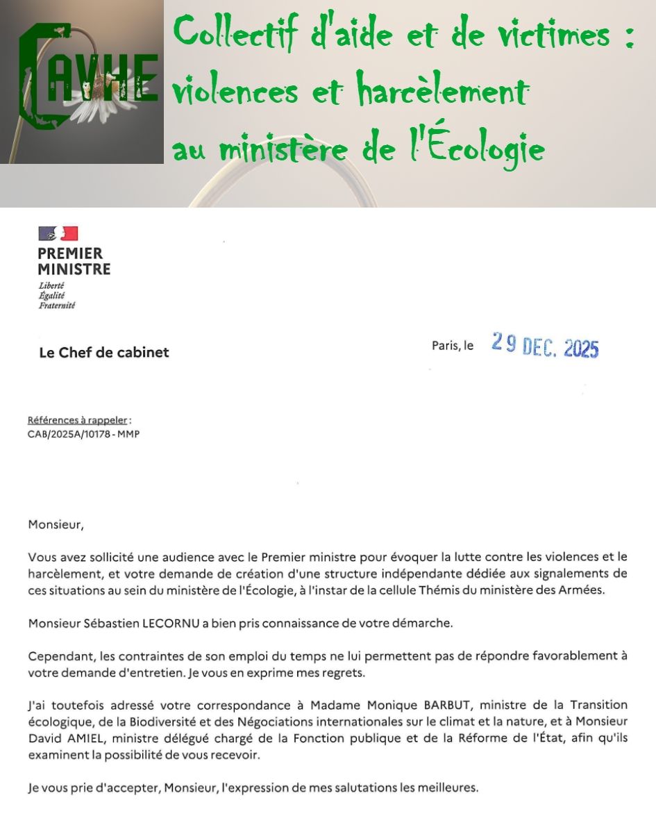 Nous avons formé un collectif pour combattre ces plaies qui gangrènent le ministère de l’Écologie, pour soutenir les victimes et pour suppléer aux insuffisances volontaires de vos services. Afin de mettre en adéquation vos promesses avec un début de réalité, afin de respecter votre engagement, nous vous demandons de bien vouloir informer les agents de ce ministère de notre existence et de notre initiative.