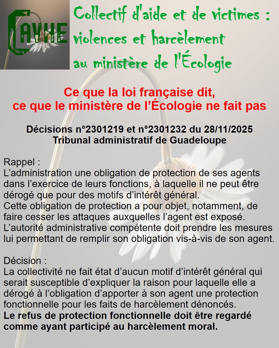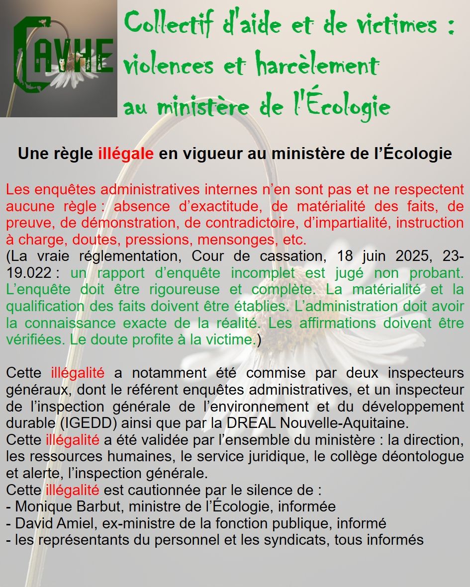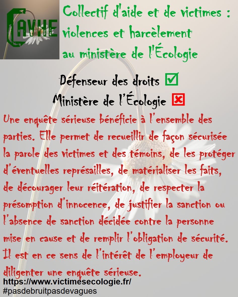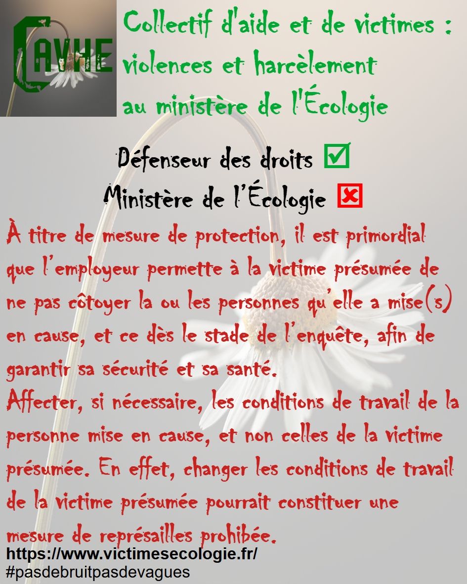 Même si les lois françaises sont censées vous protéger, gardez en mémoire qu’elles ne sont pas appliquées au ministère de l’Écologie, que l’objectif sera d’étouffer votre affaire, par tous les moyens, que vous deviendrez coupable, que vous serez menacé et sanctionné et, enfin, que vous serez muté de force.