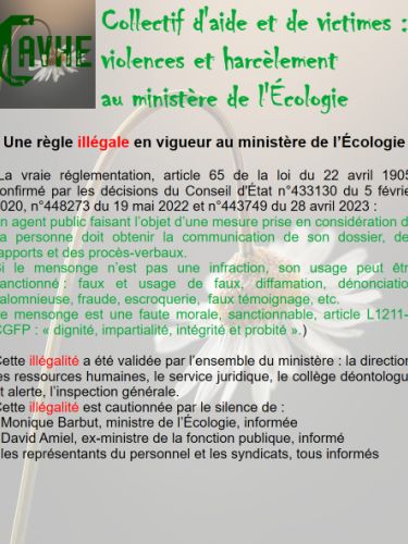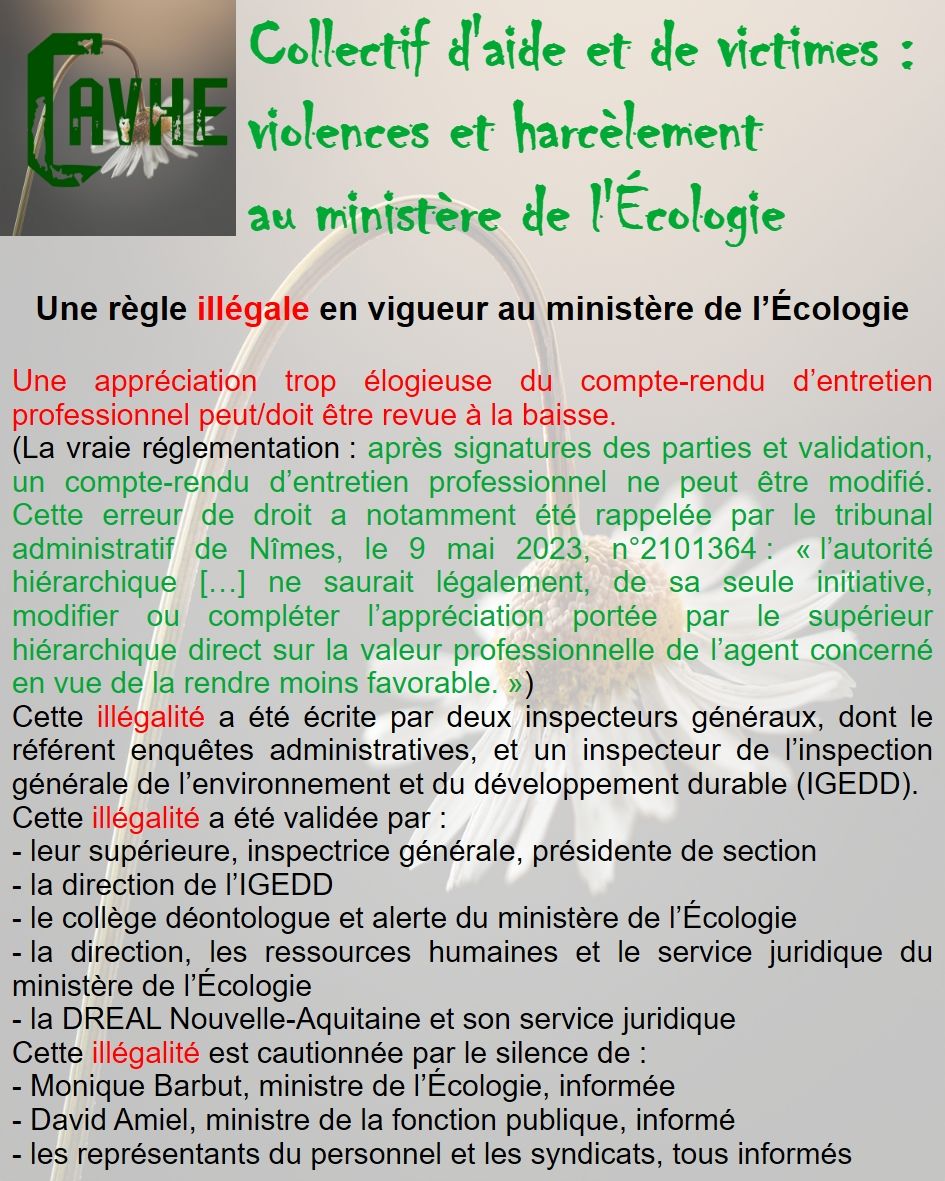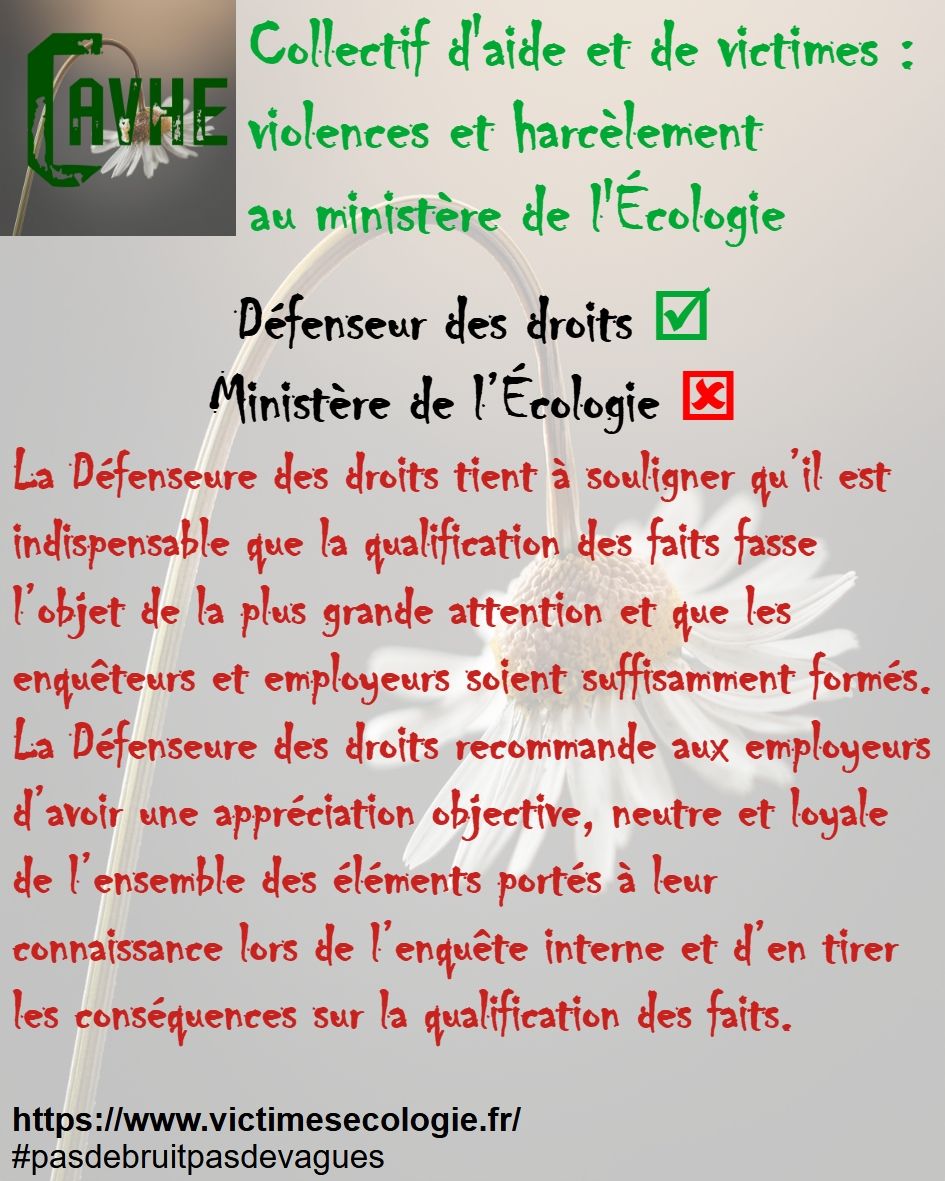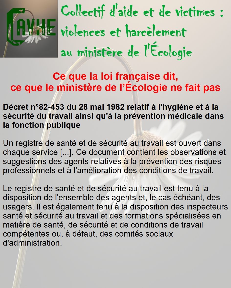 Même si les lois françaises sont censées vous protéger, gardez en mémoire qu’elles ne sont pas appliquées au ministère de l’Écologie, que l’objectif sera d’étouffer votre affaire, par tous les moyens, que vous deviendrez coupable, que vous serez menacé et sanctionné et, enfin, que vous serez muté de force.