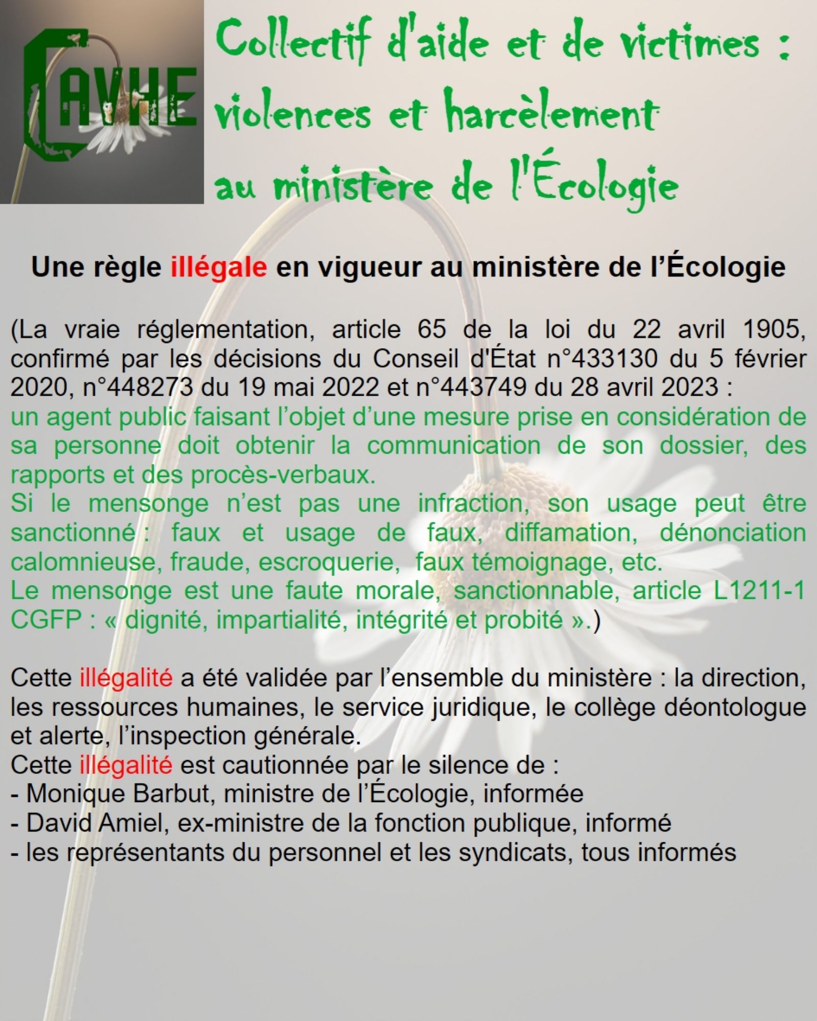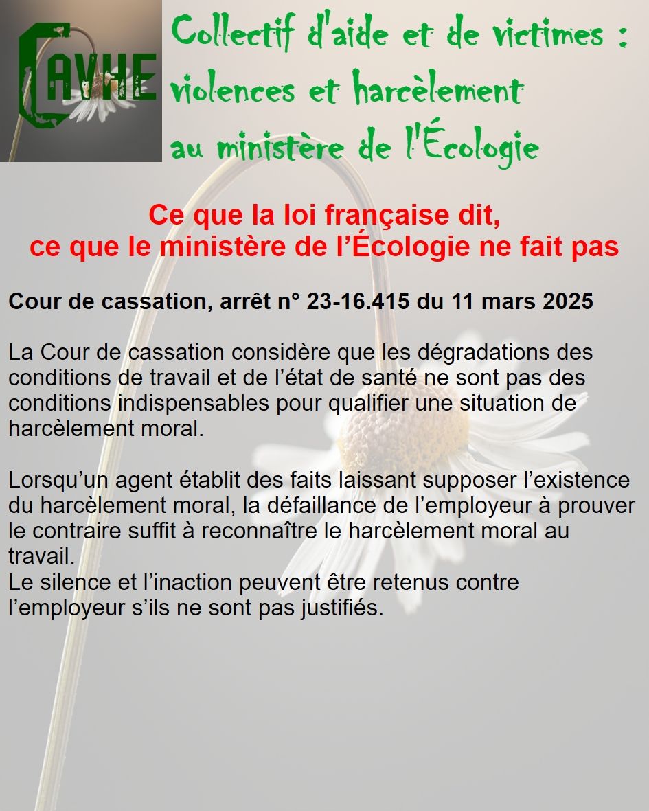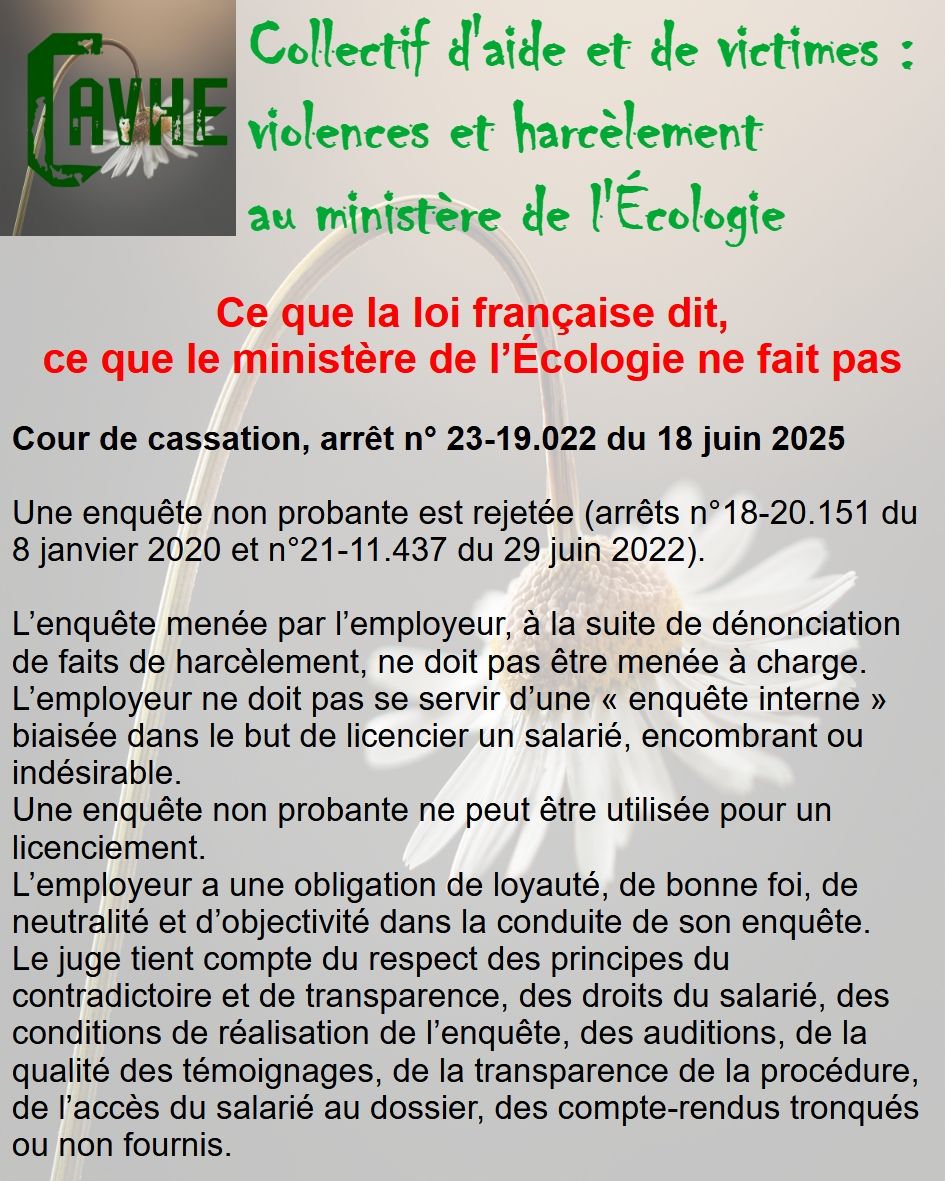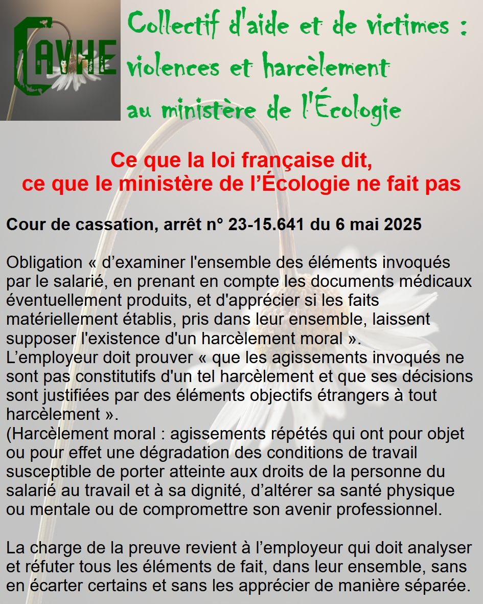 Même si les lois françaises sont censées vous protéger, gardez en mémoire qu’elles ne sont pas appliquées au ministère de l’Écologie, que l’objectif sera d’étouffer votre affaire, par tous les moyens, que vous deviendrez coupable, que vous serez menacé et sanctionné et, enfin, que vous serez muté de force.