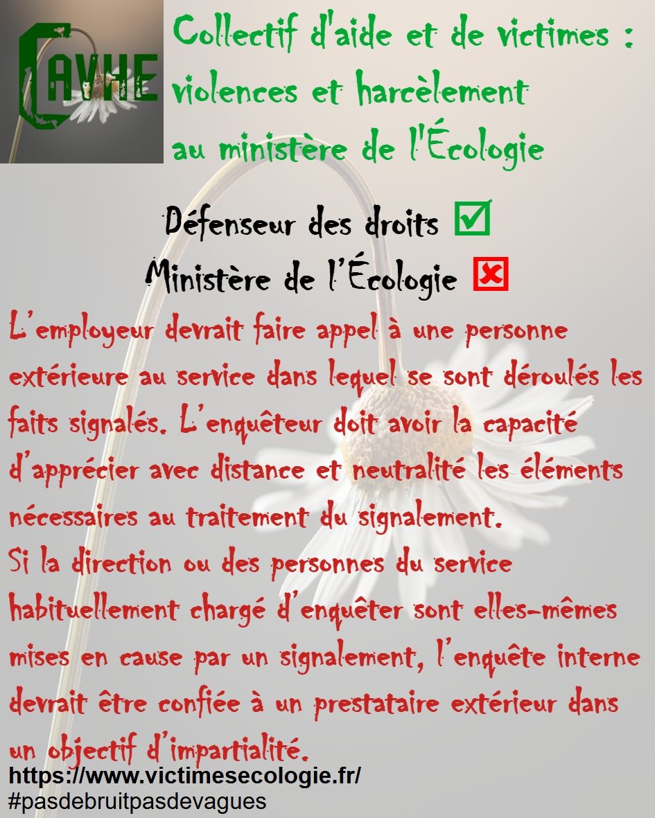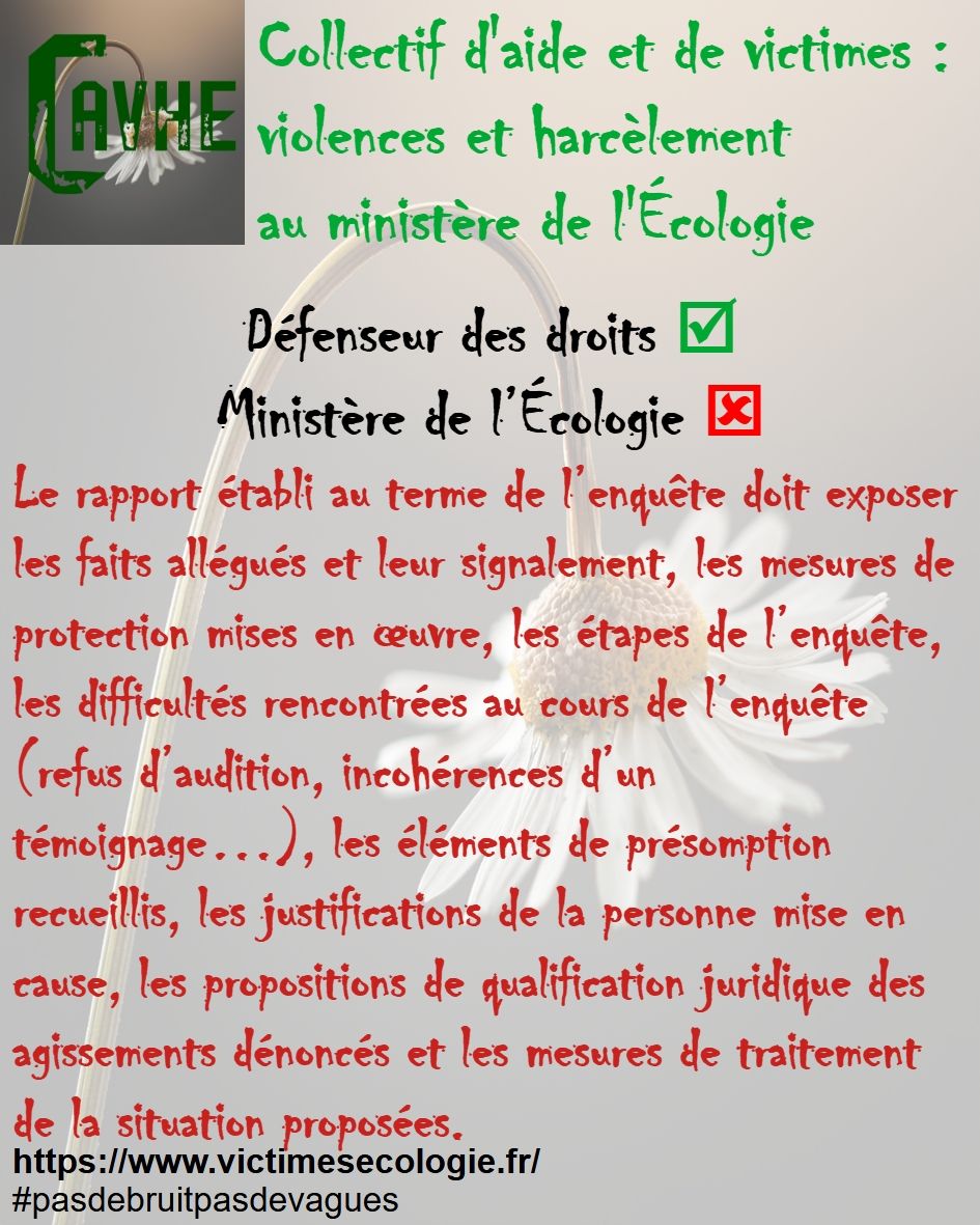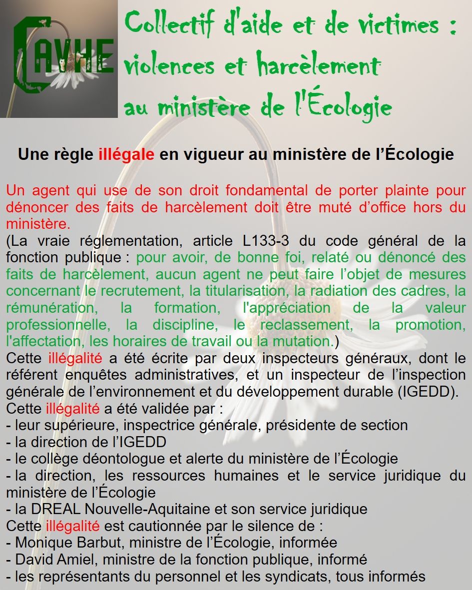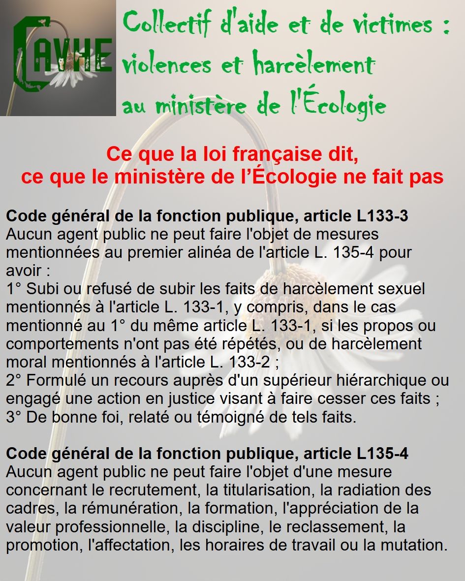 Même si les lois françaises sont censées vous protéger, gardez en mémoire qu’elles ne sont pas appliquées au ministère de l’Écologie, que l’objectif sera d’étouffer votre affaire, par tous les moyens, que vous deviendrez coupable, que vous serez menacé et sanctionné et, enfin, que vous serez muté de force.