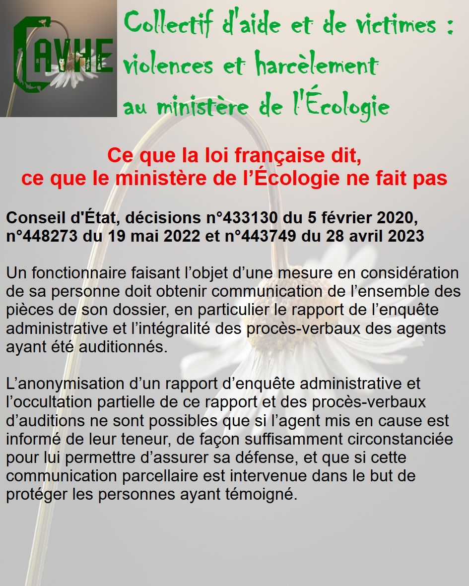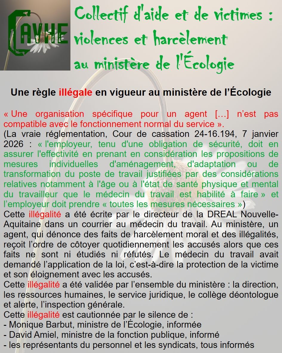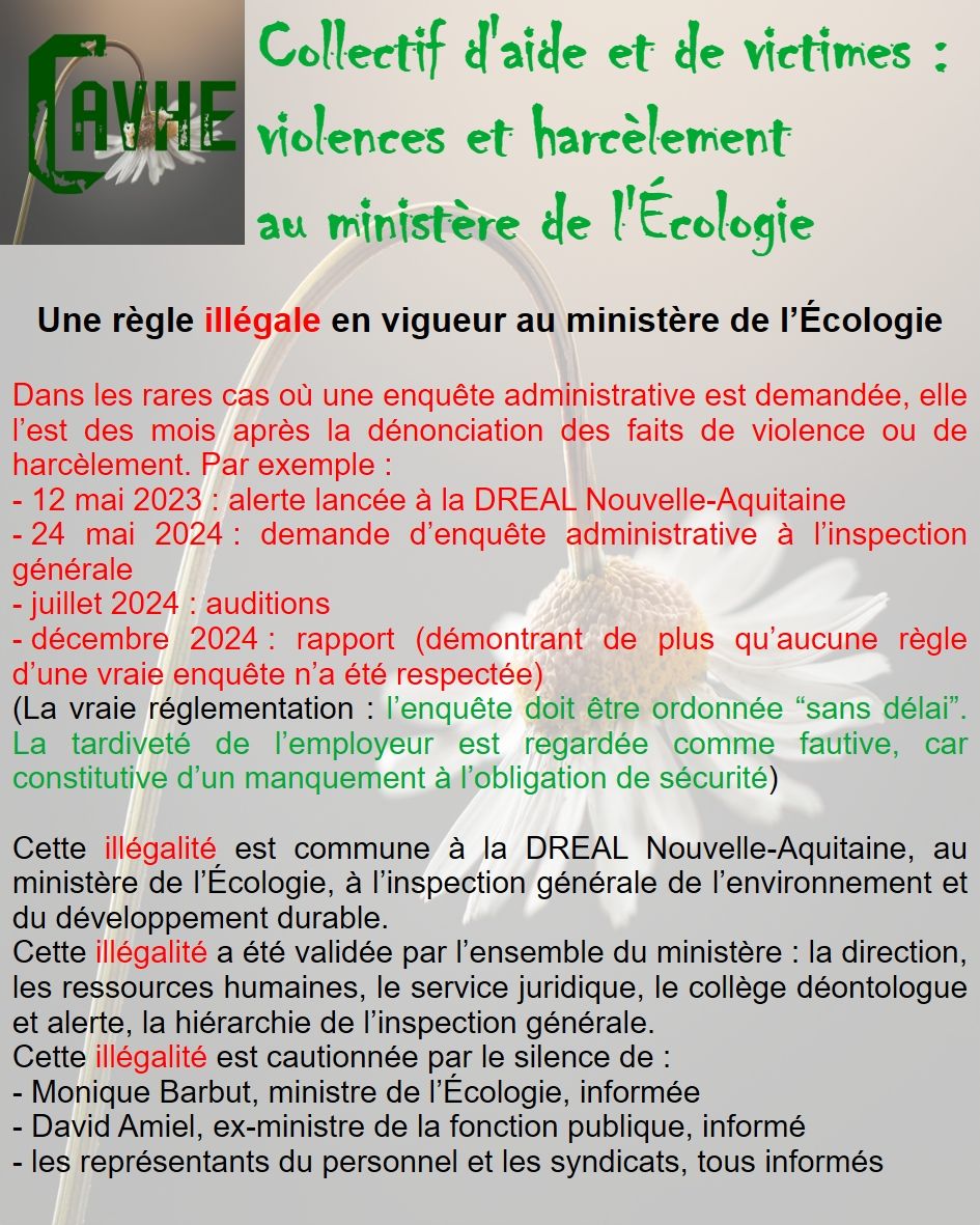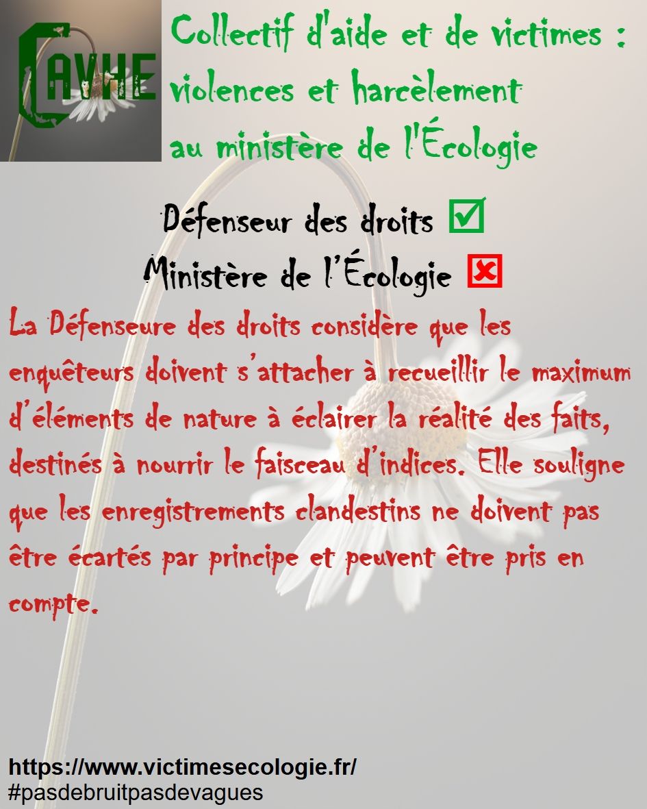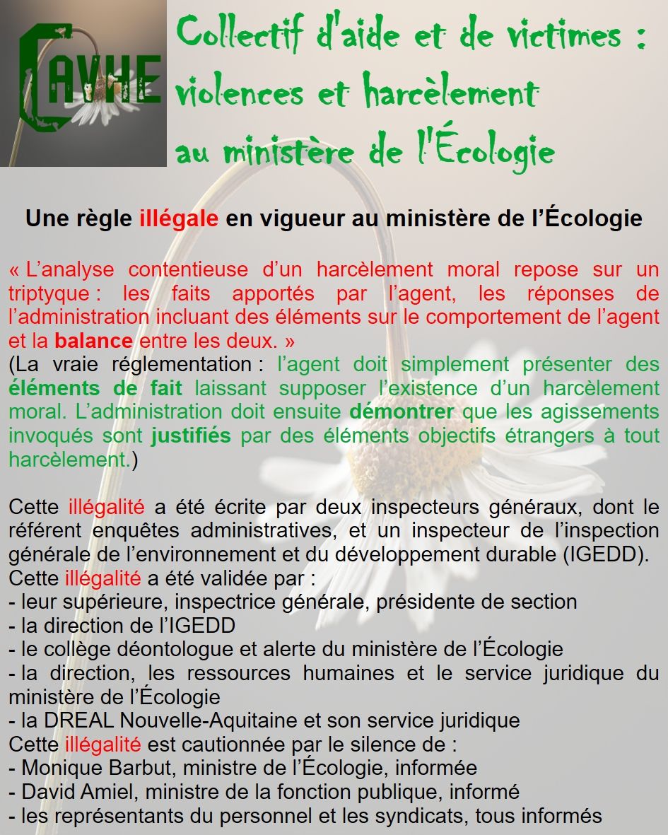 Même si les lois françaises sont censées vous protéger, gardez en mémoire qu’elles ne sont pas appliquées au ministère de l’Écologie, que l’objectif sera d’étouffer votre affaire, par tous les moyens, que vous deviendrez coupable, que vous serez menacé et sanctionné et, enfin, que vous serez muté de force.