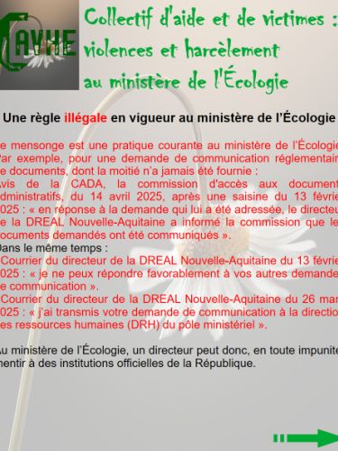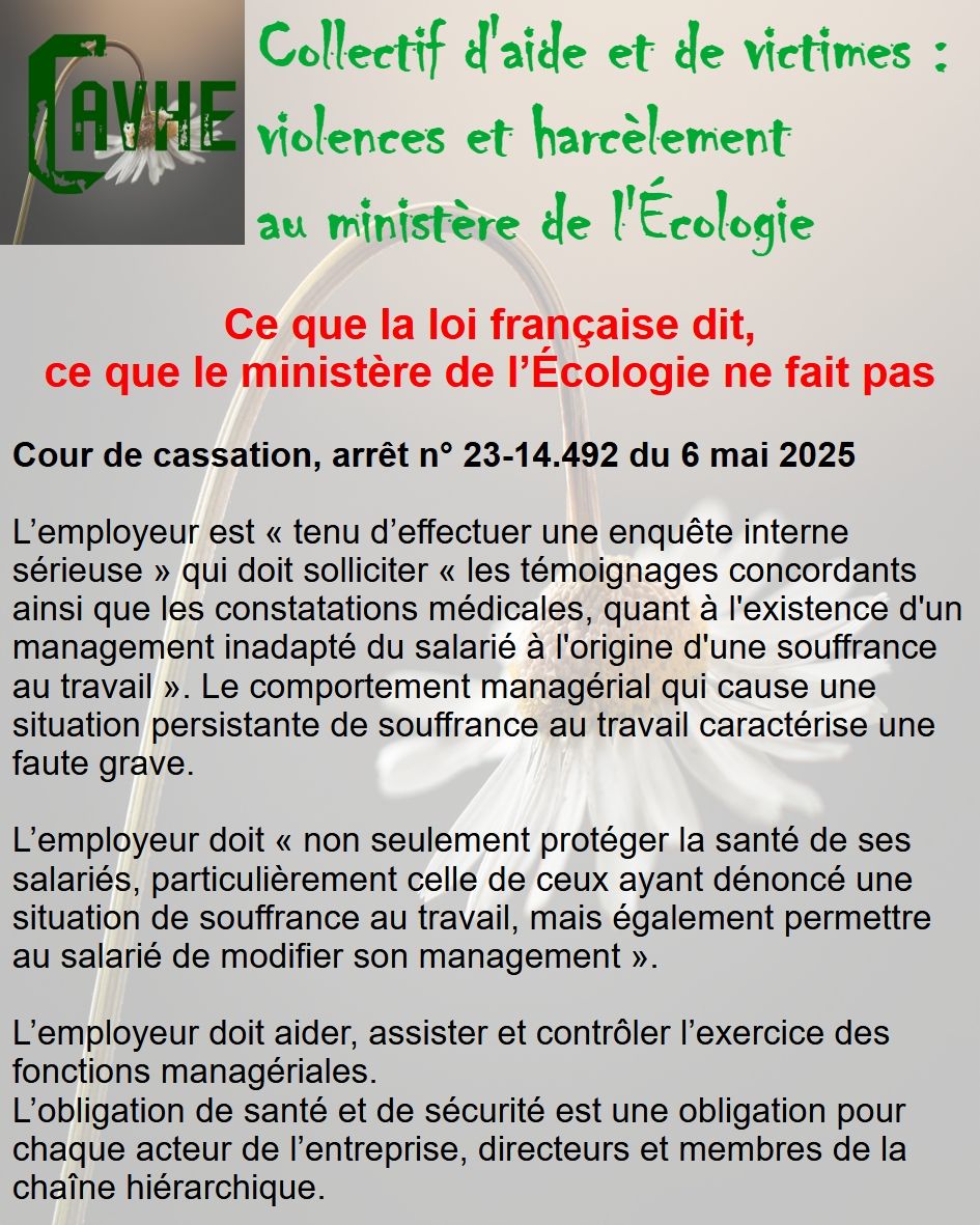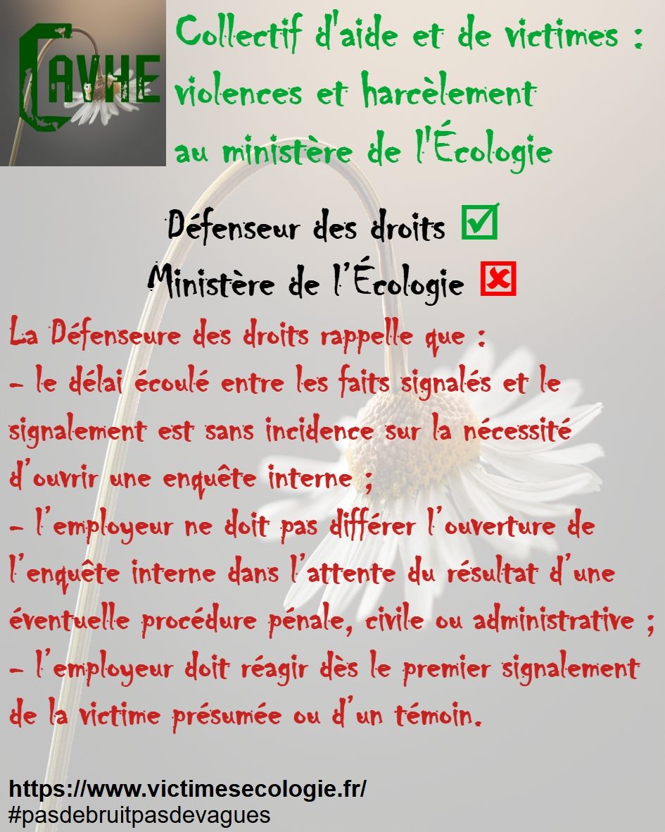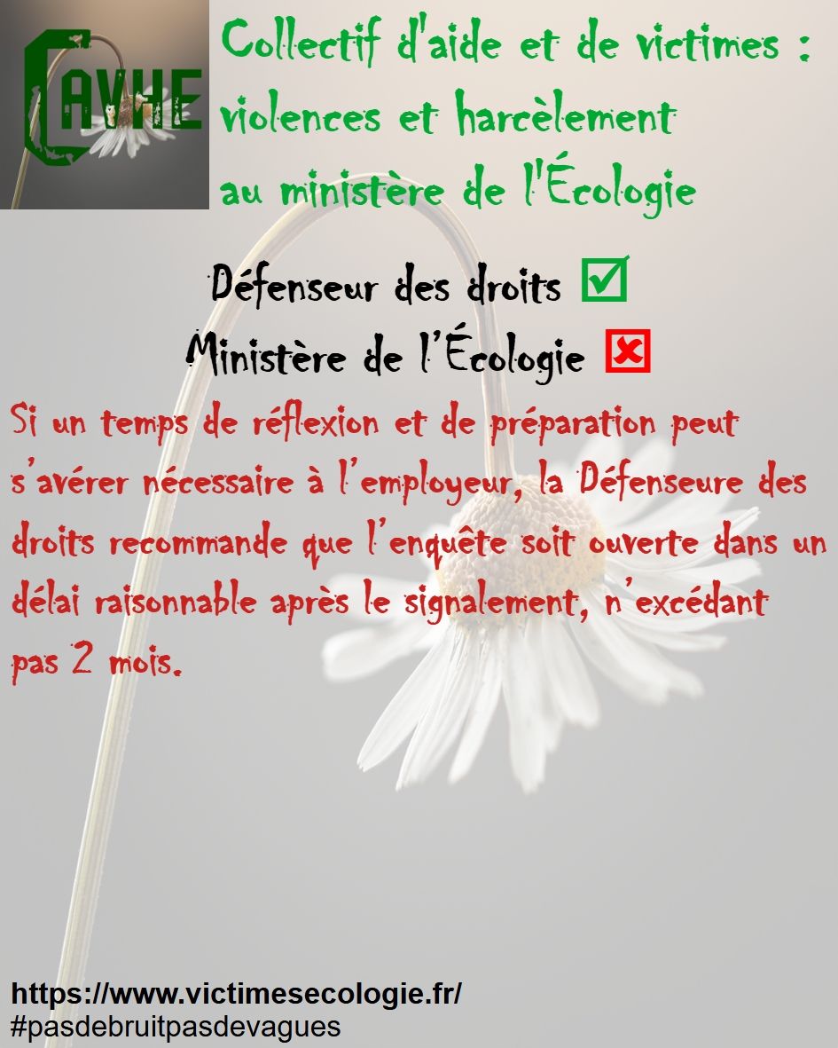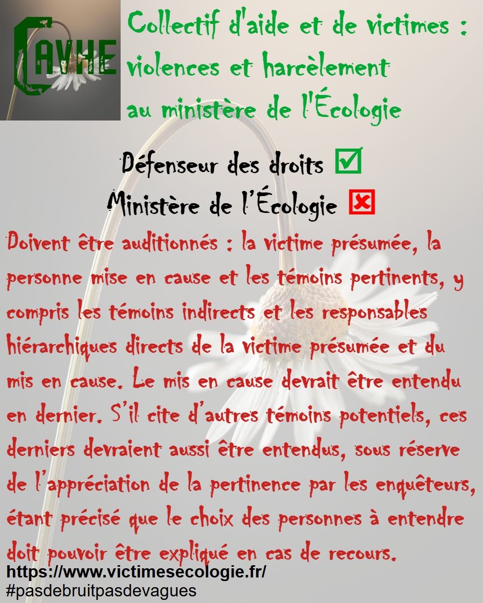 Même si les lois françaises sont censées vous protéger, gardez en mémoire qu’elles ne sont pas appliquées au ministère de l’Écologie, que l’objectif sera d’étouffer votre affaire, par tous les moyens, que vous deviendrez coupable, que vous serez menacé et sanctionné et, enfin, que vous serez muté de force.