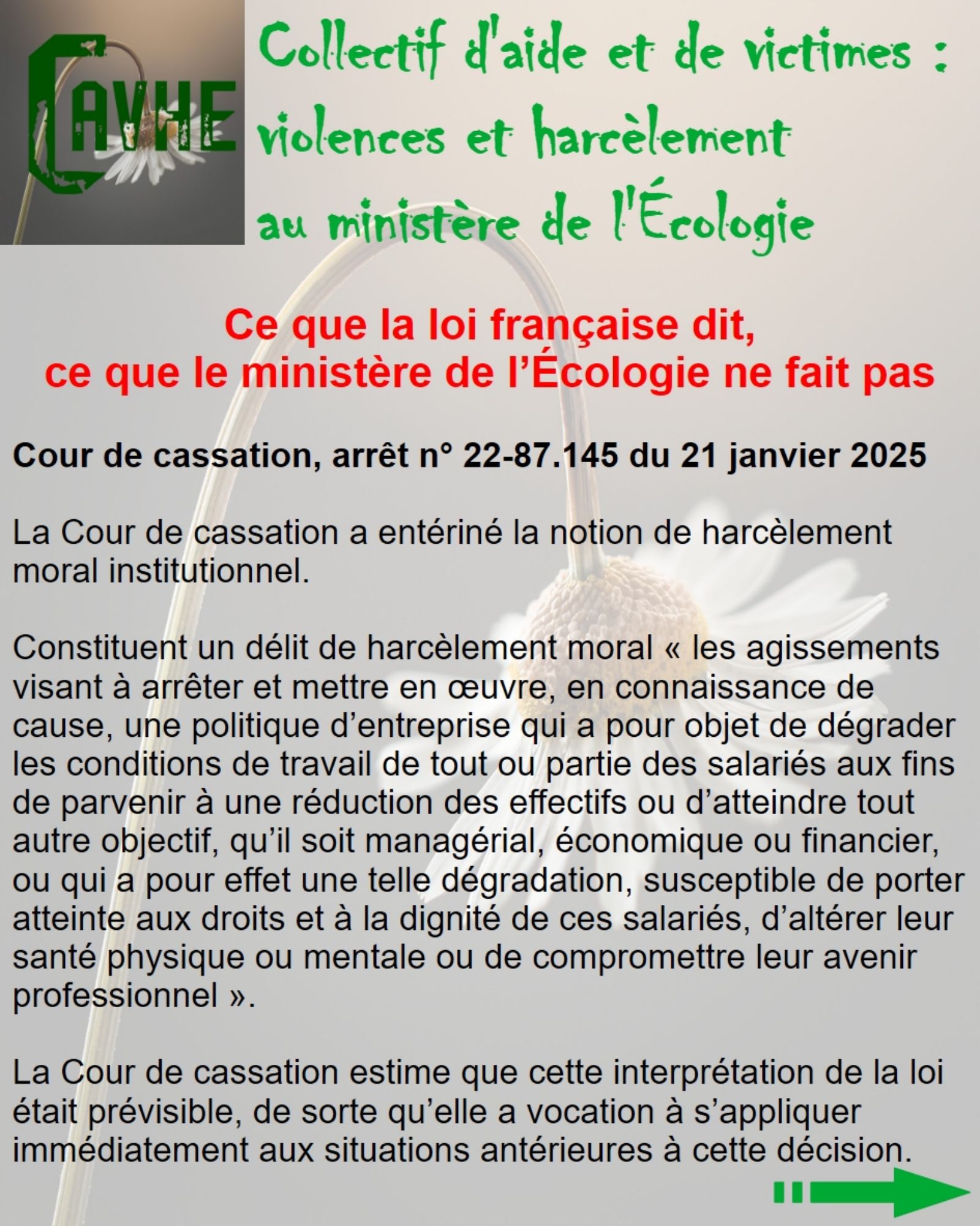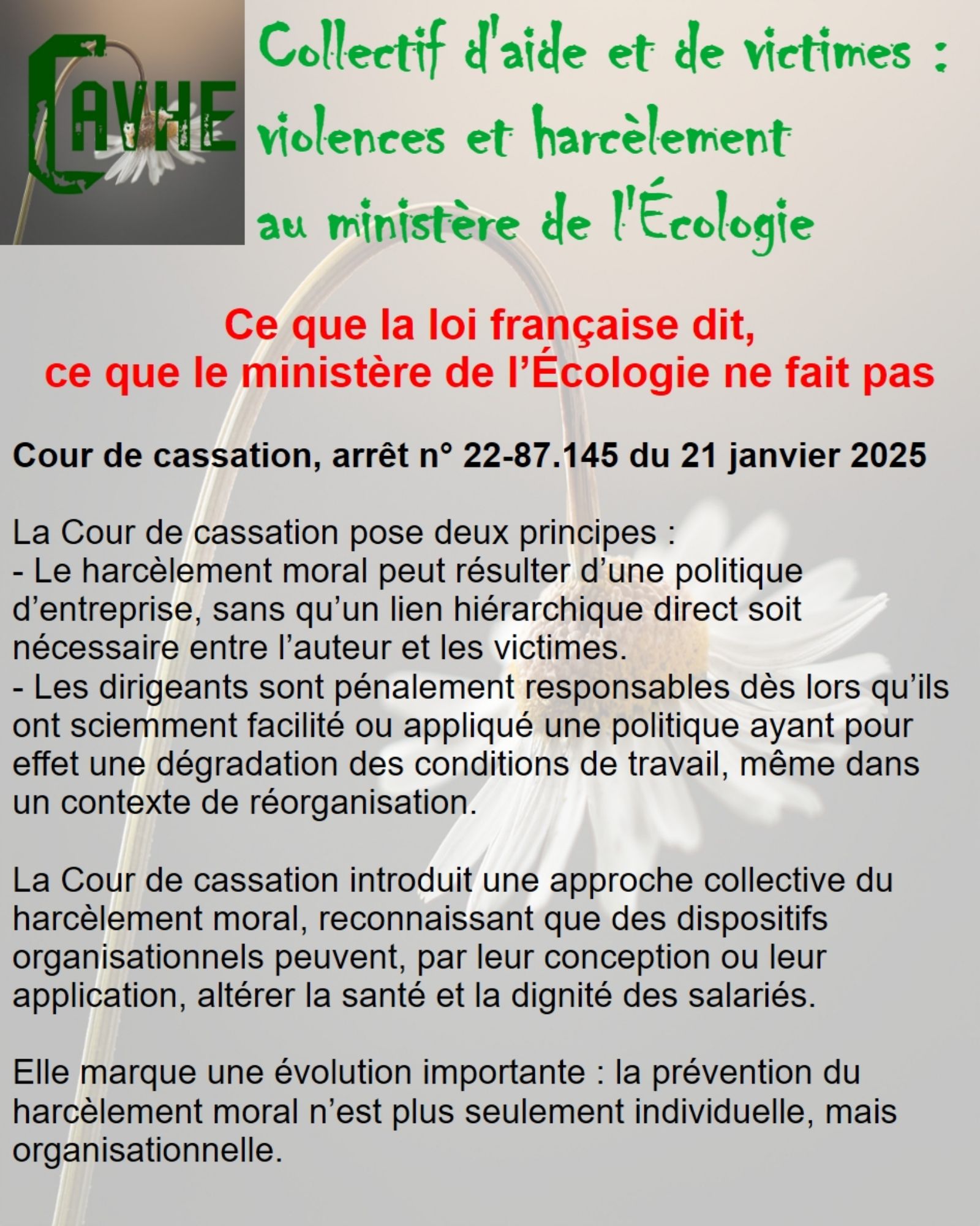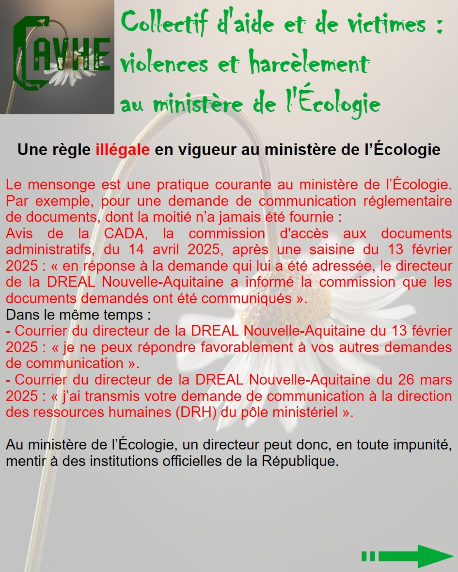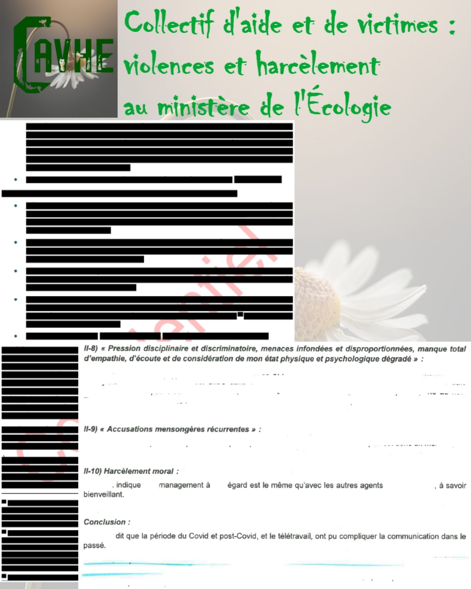 Même si les lois françaises sont censées vous protéger, gardez en mémoire qu’elles ne sont pas appliquées au ministère de l’Écologie, que l’objectif sera d’étouffer votre affaire, par tous les moyens, que vous deviendrez coupable, que vous serez menacé et sanctionné et, enfin, que vous serez muté de force.